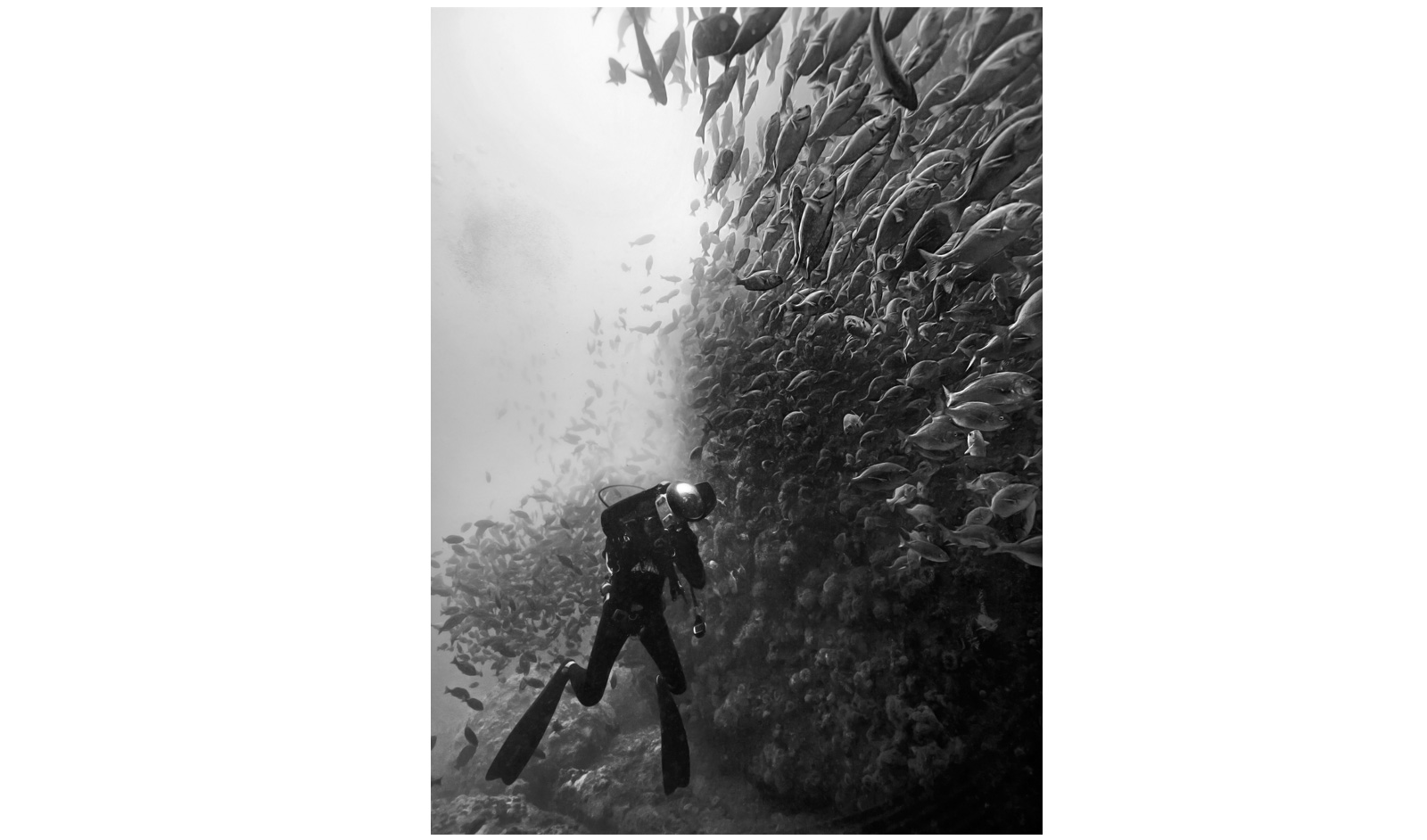 A school of fish towers over a diver at Pinnacles off the coast of Cape Town, South Africa.