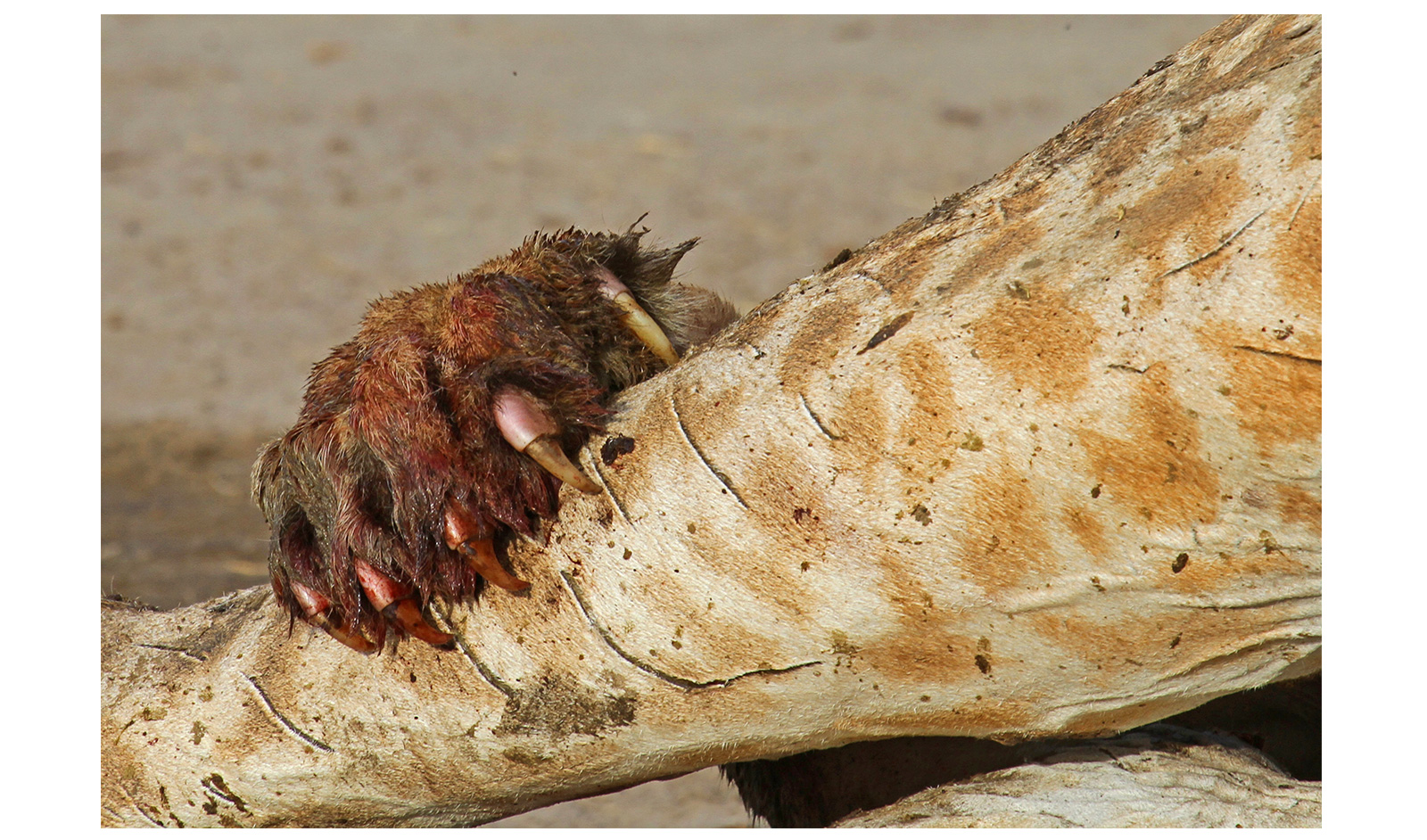 A lion’s claws fixed on the leg of its giraffe prey in Ruaha National Park, Tanzania.
