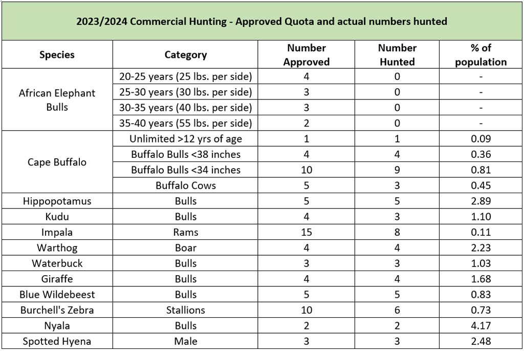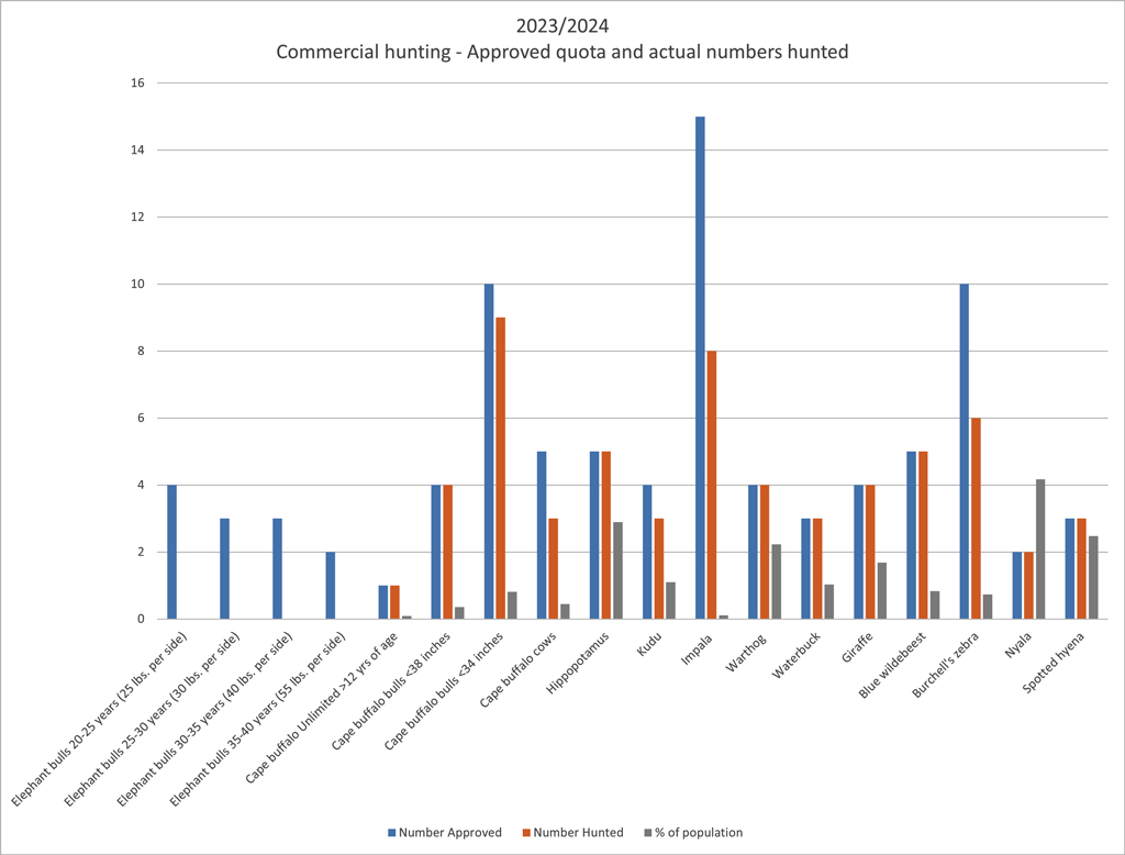 Details regarding approved and actual hunting offtake provide clues into the reserve’s approach to sustainable utilisation. No elephant bulls were hunted due to CITES restrictions, but quotas had been allocated for specific age classes based on tusk size per side. On the other hand, Cape buffalo hunting followed trophy measurement guidelines based on population insights obtained through annual surveys.