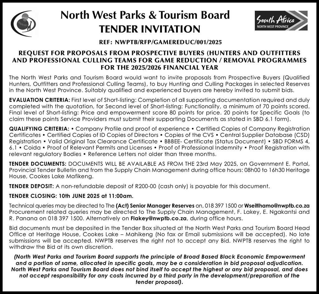 In the original tender documentation, NWPTB invited proposals from professional hunters, outfitters, and culling teams to hunt wildlife in 14 provincial reserves during the 2025/2026 financial year. The tender proposal guidelines suggested that all hunting activities must be completed by 30 September 2025. In addition to Madikwe and Pilanesberg, other North West provincial reserves such as S.A. Lombard Nature Reserve and Molopo Nature Reserve were also included in the document. Three categories of game removal – including trophy hunting, biltong hunting and culling were cited for different reserves. Various species were included in different categories, including Cape buffalo, wildebeest, blesbok and zebra.